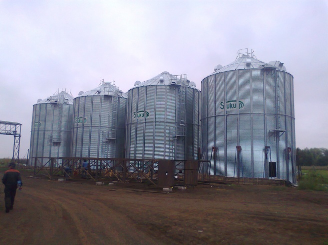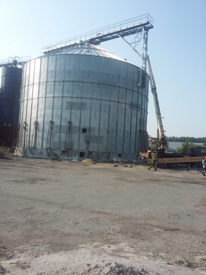 Выполнена первая очередь. (4 силоса, сушилка, завальная яма). Геодезия, разработка грунта, изготовление фундамента (4+2) шт под силоса и вышки, Монтаж силоса (Лидсельмаш) 4шт и 1 конусный, Монтаж вышки 1шт, монтаж галереи и транспортного оборудования, изготовление и монтаж накопительного бункера. Строительство завальной ямы (Бетон, металлокаркас, обшивка, изготовление приемных бункеров зерна, установка транспортного оборудования зерна. Монтаж сушилки.